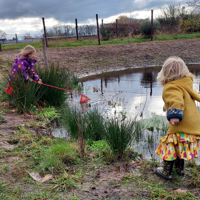 ‘Mogen wij schepnetten?’, vroeg mijn driejarige zoontje vrolijk. Schepnetten is hier een woord geworden, ook al bestaat het eigenlijk niet. Onze kinderen zijn dol op de poel die we hebben bij de paarden, en ook op de natuurlijke vijver iets verderop op het terrein. Met grote regelmaat gaan we dan ook naar buiten, regenlaarsjes aan, schepnet in de hand. De oudste zoekt naar beestjes, de jongste vindt het gewoon geweldig om spetters te maken door met zijn netje op het water te slaan. Geregeld gaan ze ook op jacht naar bladeren die in de poel zijn gewaaid en scheppen ze eendenkroos uit het water.